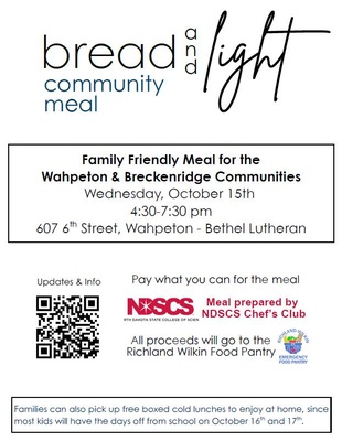 Family Friendly Meal fro the Wahpeton & Breckenridge CommunitiesFamilies can also pick up free boxed cold lunches to enjoy at home, since most kids will have the days off from school on October 16th & 17th.