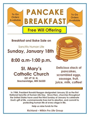 Delicious stack of pancakes, scrambled eggs, sausage, fruit, juice, milk & coffee.