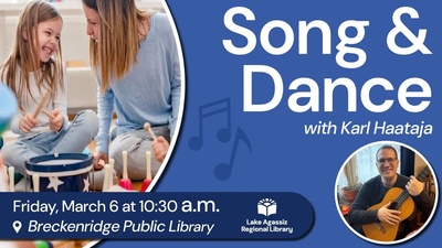 Join us at the Breckenridge Public Library for a musical event featuring licensed music teacher and songwriter Karl Haataja. We will sing, dance and create our own original music - bring your dancing shoes! This event is geared for youth ages 2-10, but all ages are welcome.