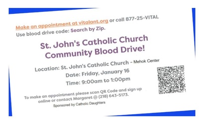 St John's Blood Drive St John's Catholic Church Community Blood Drive Images Gallery Image × St John's Blood Drive Set a Reminder Enter your email address below to receive a reminder message. Email address Select the amount of Days before the event -- Select Days Before Event -- 1 Day 2 Days 3 Days 1 Week Captcha Validation Please complete the Captcha Submit Date and Time Friday Jan 16, 2026 9:00 AM - 1:00 PM CST Friday, January 16th Time: 9:00am - 1:00pm Location St John's Church - Mehok Center Contact Information Margaret - 218-643-5173 Set a Reminder Enter your email address below to receive a reminder message. Email address Select the amount of Days before the event -- Select Days Before Event -- 1 Day 2 Days 3 Days 1 Week Captcha Validation Please complete the Captcha Submit Share × Print Email Add to Calendar Facebook Twitter LinkedIn Tell a Friend × Select Calendar Type × Google Yahoo iCal (Outlook, Apple, or other)