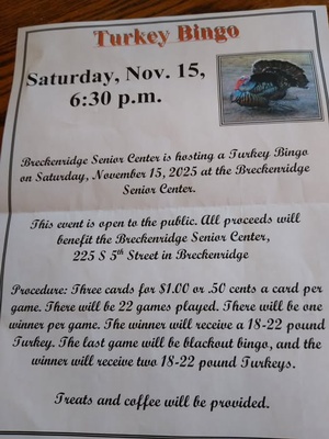 Turkey Bingo Turkey Bingo Images Gallery Image × Turkey Bingo Set a Reminder Enter your email address below to receive a reminder message. Email address Select the amount of Days before the event -- Select Days Before Event -- 1 Day 2 Days 3 Days 1 Week Captcha Validation Please complete the Captcha Submit Date and Time Saturday Nov 15, 2025 6:30 PM - 8:30 PM CST Saturday, November 15, 6:30pm Location Breckenridge Senior Center 225 5th St S Breckenridge, MN Fees/Admission $1.00 for 3 cards or $.50 per card Set a Reminder Enter your email address below to receive a reminder message. Email address Select the amount of Days before the event -- Select Days Before Event -- 1 Day 2 Days 3 Days 1 Week Captcha Validation Please complete the Captcha Submit Share × Print Email Add to Calendar Facebook Twitter LinkedIn Tell a Friend × Select Calendar Type × Google Yahoo iCal (Outlook, Apple, or other)