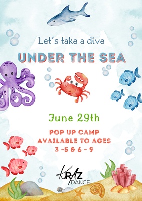 Under The Sea Dance camp @ KrAz Under The Sea pop-up camp June 29th Ages: 3-5 & 6-9 Images Gallery Image × Under The Sea Dance camp @ KrAz Set a Reminder Enter your email address below to receive a reminder message. Email address Select the amount of Days before the event -- Select Days Before Event -- 1 Day 2 Days 3 Days 1 Week Captcha Validation Please complete the Captcha Submit Date and Time Monday Jun 29, 2026 June 29th Location KrAz Dance Set a Reminder Enter your email address below to receive a reminder message. Email address Select the amount of Days before the event -- Select Days Before Event -- 1 Day 2 Days 3 Days 1 Week Captcha Validation Please complete the Captcha Submit Share × Print Email Add to Calendar Facebook Twitter LinkedIn Tell a Friend × Select Calendar Type × Google Yahoo iCal (Outlook, Apple, or other)